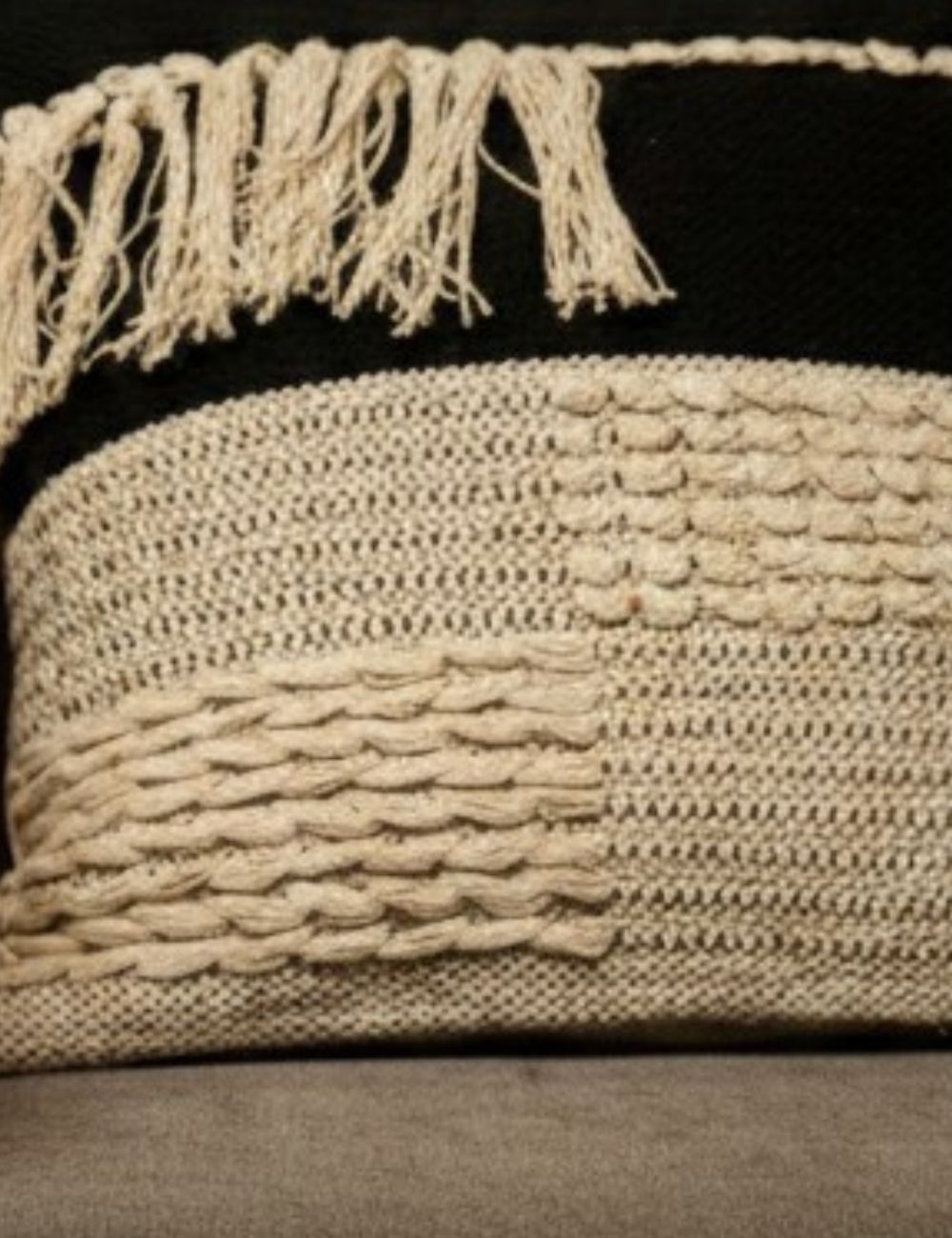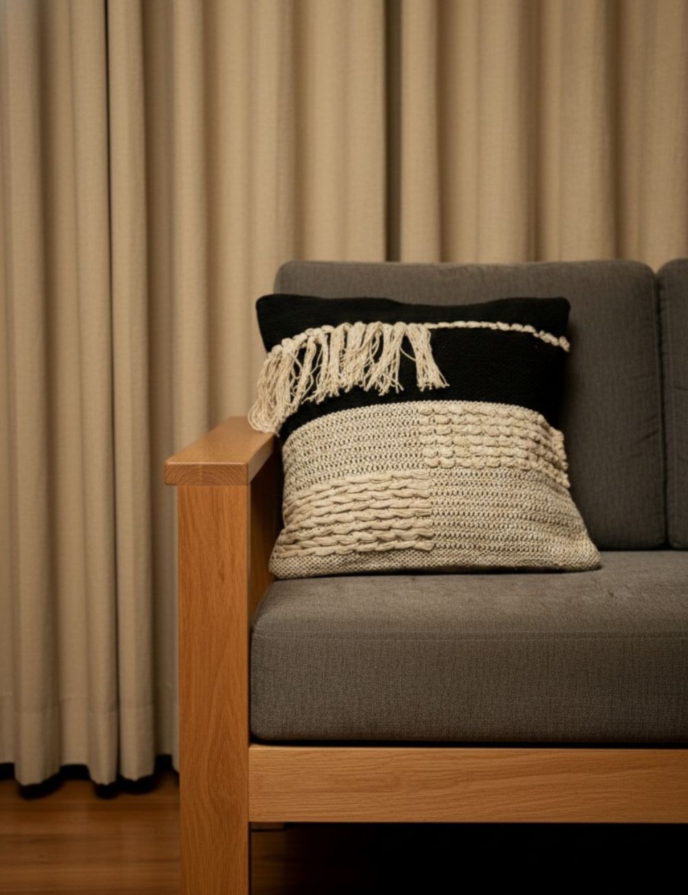 Add warmth and artisanal charm to your living space with this beautifully crafted textured cushion cover. Featuring a striking black and natural color block design, this cover blends cozy knit patterns with soft fringe detailing for a modern bohemian look that instantly elevates your sofa, armchair, or bed.