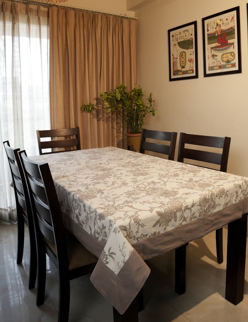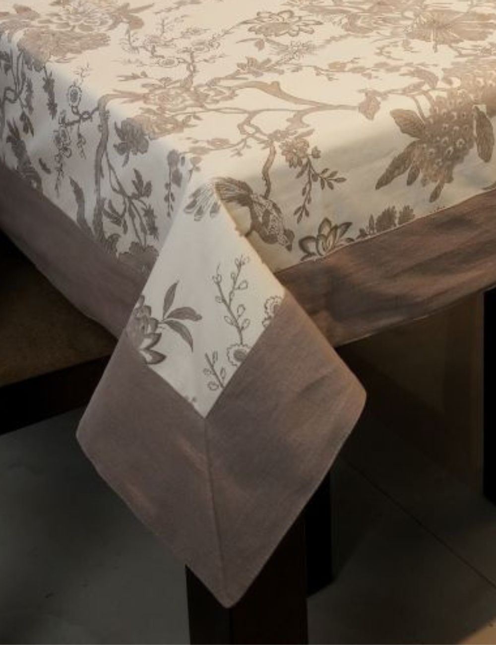 Create a calm and sophisticated dining setting with the Ivory Garden Dining Table Cover. Designed with an elegant botanical print in subtle beige and taupe tones on a soft ivory base, this cover brings understated charm and effortless refinement to your table. The coordinated solid border enhances the design with a clean, structured finish.