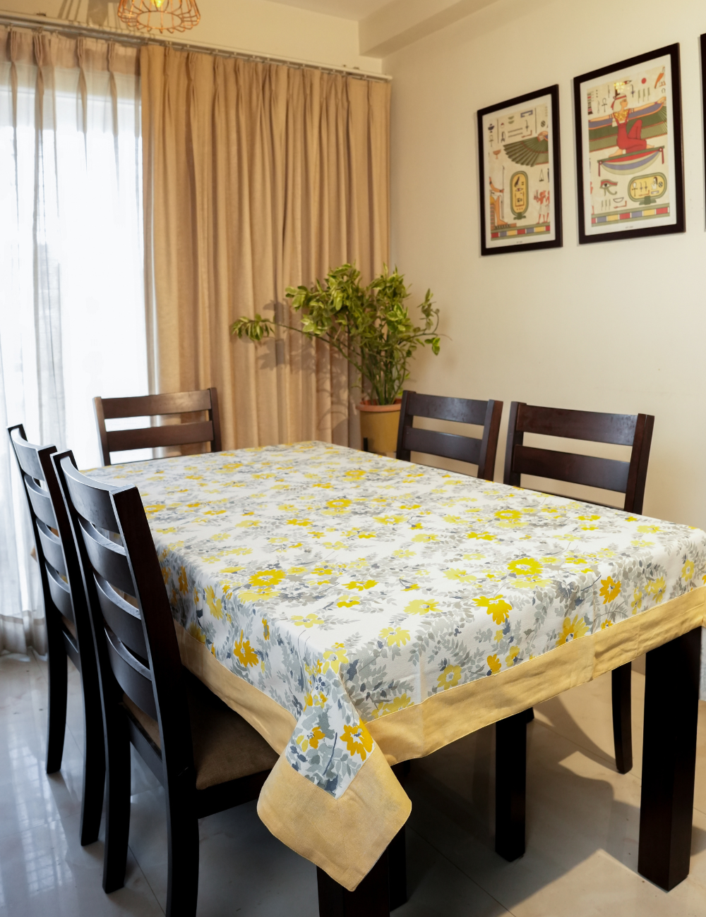 Infuse your dining space with cheerful elegance using the Sunflower Mist Dining Table Cover. Designed with vibrant yellow blossoms set against soft grey foliage on a light base, this cover creates a refreshing and uplifting table setting. The coordinating solid yellow border adds warmth and structure, giving the overall look a clean and polished finish.